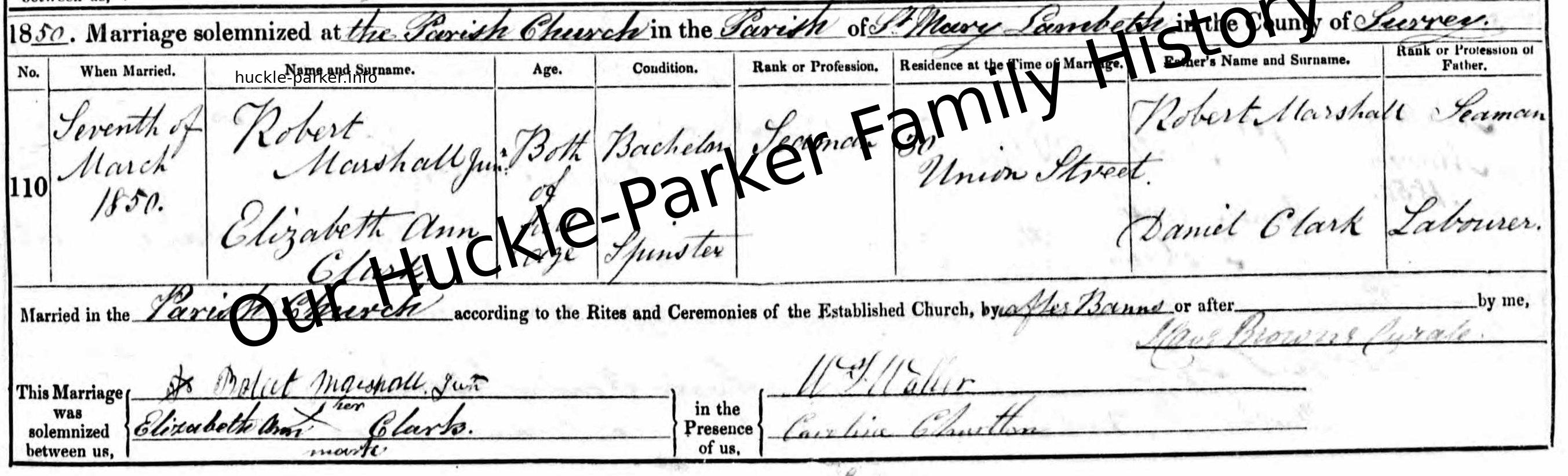| Marriage of a child | Robert Marshall — Elizabeth Ann Clark — View this family Type: Religious marriage 7 March 1850 (Age 45 years)Address: Union st, Bermondsey Note: At time of marriage he was a seaman |
