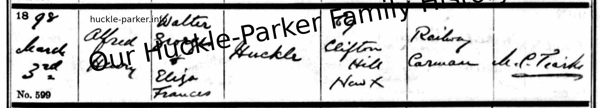 | Baptism of a son | Alfred Henry Huckle 3 March 1898 (Age 28 years) Address: 69 Clifton Hill, New cross England |