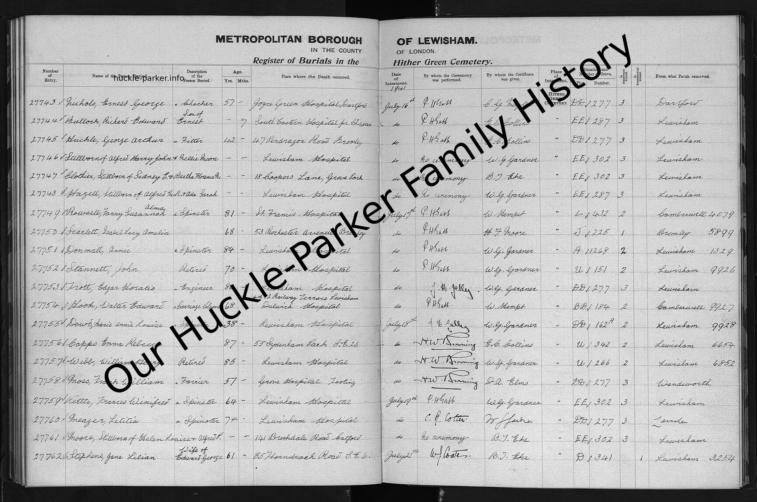 Birth: 1 February 1870 — Greenwich London Death: 20 November 1949 — 54 Pagnall St, New Cross, London, SE14 |