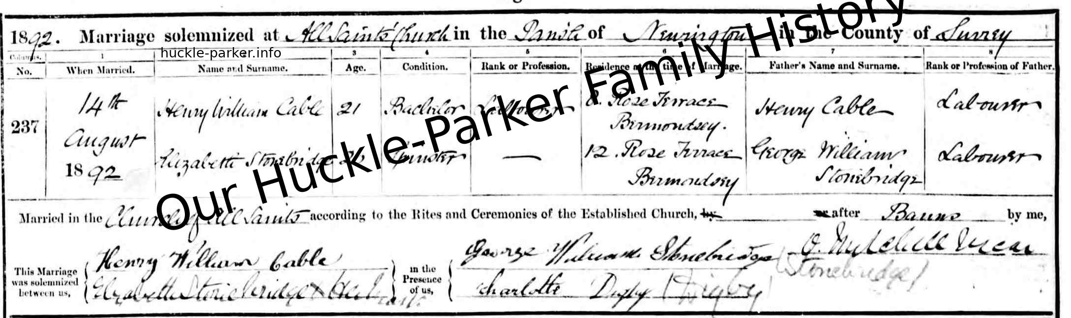 | Marriage of a child | Henry William Cable — Elizabeth Stonebridge — View this family Type: Religious marriage 14 August 1892 (Age 43 years) |