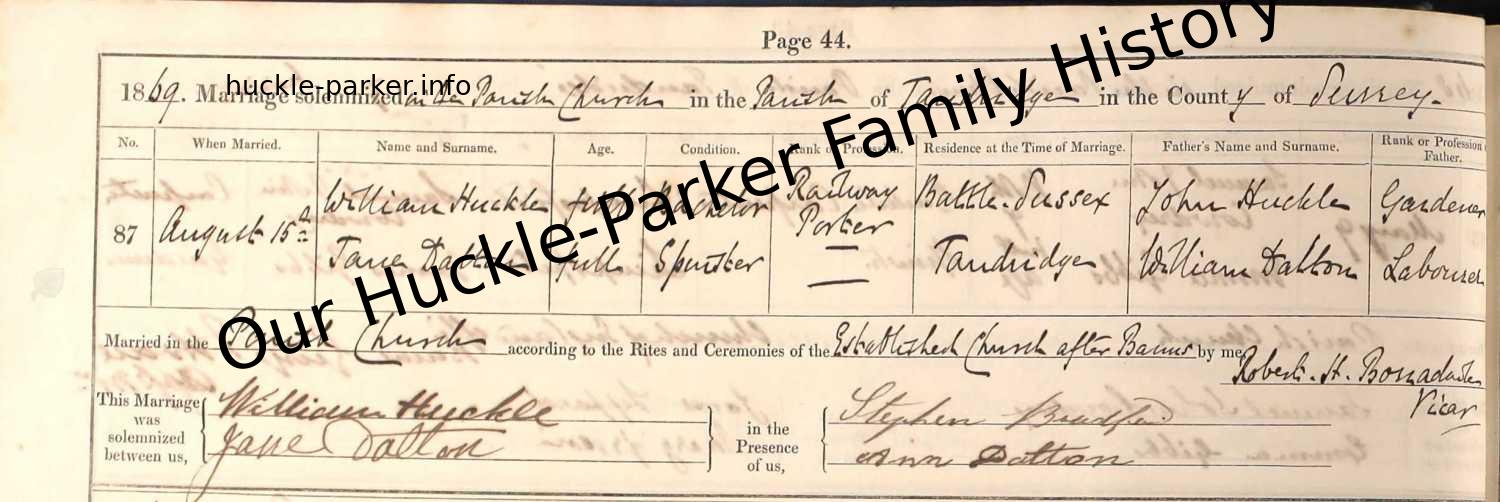 | Marriage of a child | William Huckle — Jane Dalton — View this family Type: Religious marriage 15 August 1869 (Age 54 years)Witness: Stephen Bradford — brother-in-law — brother-in-law Witness: Ann Dalton — sister-in-law — elder sister |