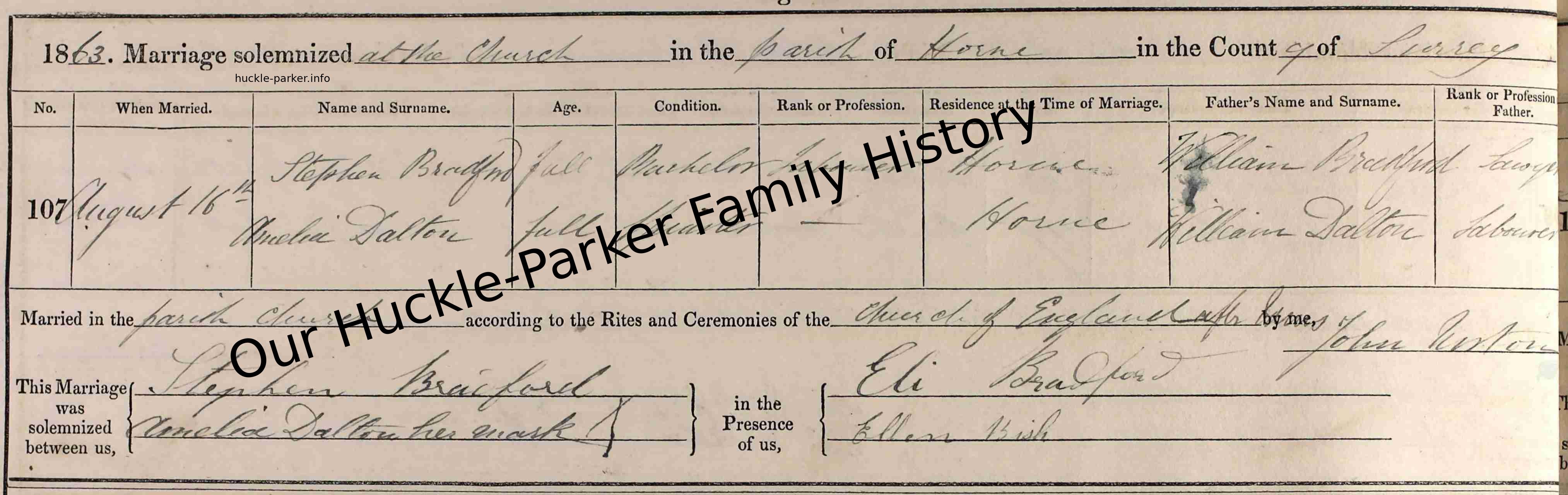Amelia Dalton, daughter of William Dalton and Jane Ongley, was born in 1839 in Bletchingley, Surrey. She married Stephen Bradford on 16 August 1863 in Parish church, Horne, Surrey. He was born in 1839 and died in November 1878 in Godstone Surrey at the age of 39 years.