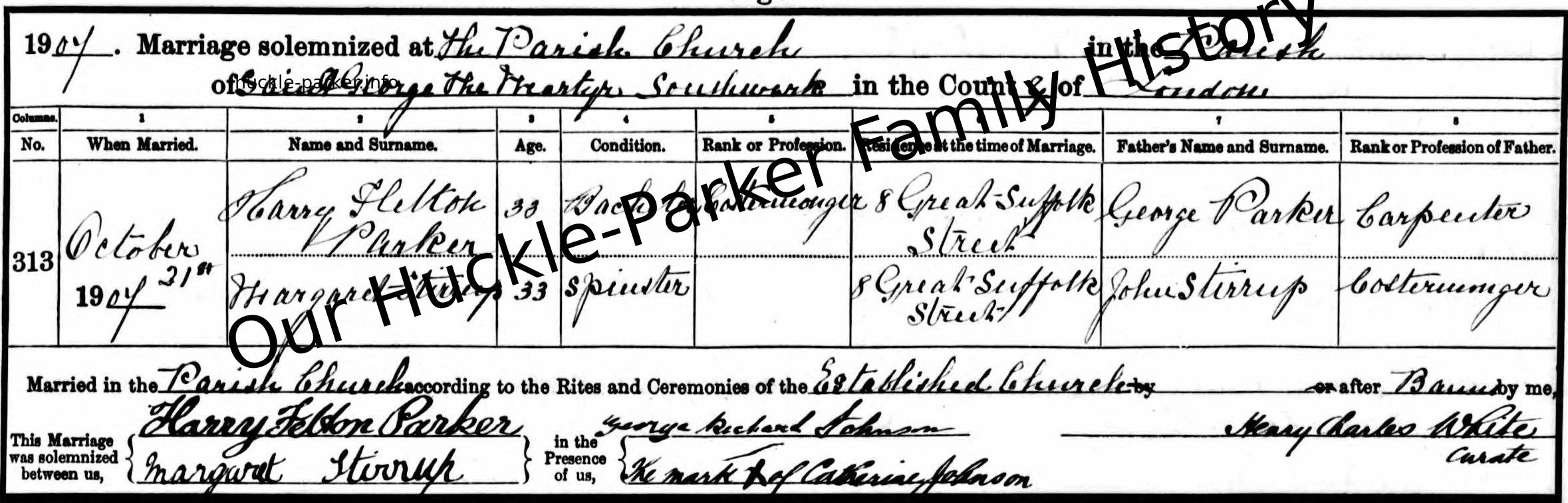 Harry Felton Parker, son of George Charles Parker and Mary Ann Parker, was born on 20 February 1874 in Marylebone, London and died on 1 March 1935 at the age of 61 years. He married Margaret Stirrup on 21 October 1907. She was born on 18 December 1874 and died in 1958 at the age of 83 years.
