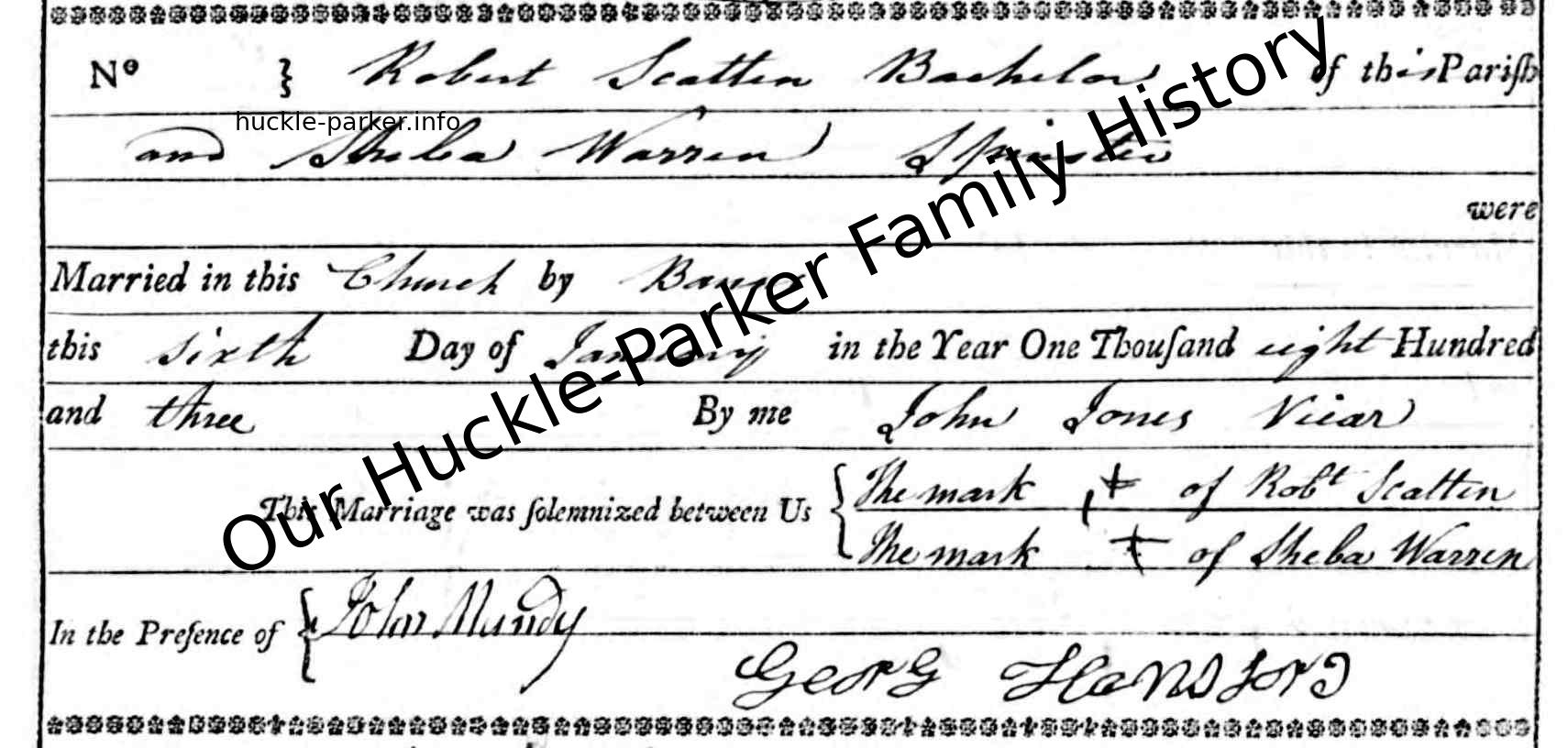 Robert Scadden, son of John Scadden and Mary Warren, was born in 1782 and died on 15 May 1853 at the age of 71 years. He married Bathsheba Warren on 5 January 1803 in Loders. She was born on 8 July 1782 and died on 17 February 1850 at the age of 67 years.