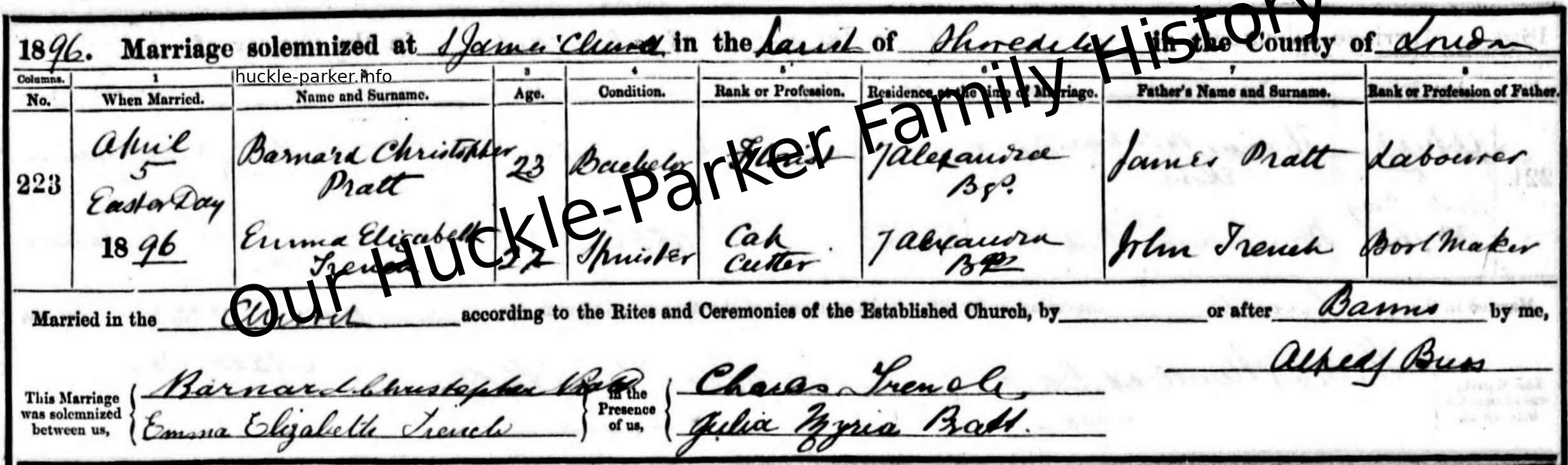 Barnard Christopher Pratt, son of James Pratt and Phillis Shannon, was born in 1873. He married Emma Elizabeth Trench on 5 April 1896 in St James, Shoreditch. She was born in 1874.