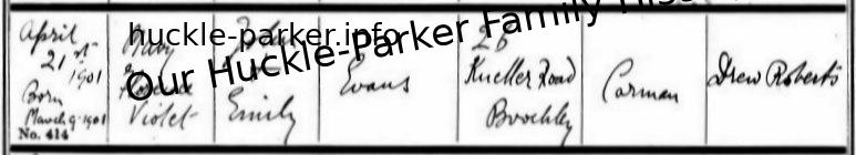 | Baptism | 21 April 1901 (Age 43 days) Address: 26 Kneller rd Brockley, London |
