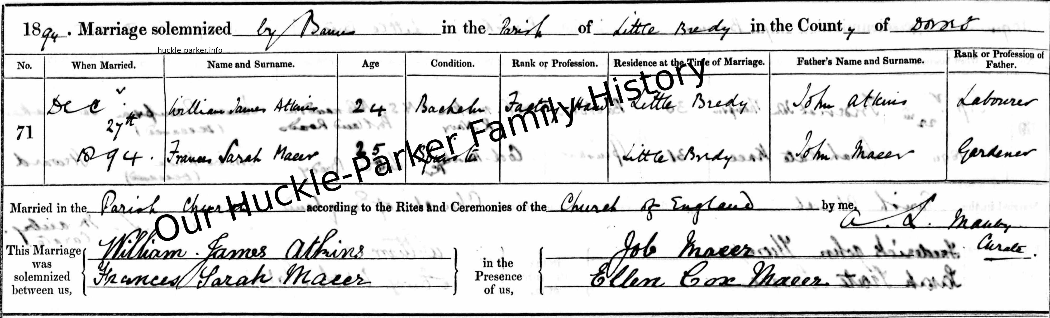 | William James Atkins | 24 | Frances Sarah Macer | 25 | 131 | Little Bredy, Dorset, England, United Kingdom | 5 | 17 October 2015 - 15:27:19 | YES | Y | ||||||